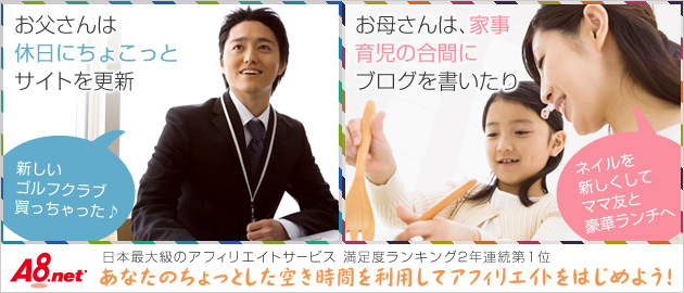 アフィリエイトとは、サイト(ホームページ)やブログを持つ運営者が、自分のサイトに企業の広告を掲載し、サイトの訪問者がその広告から商品購入やサービスを利用すると、運営者に成果報酬が支払われる広告システムです。A8.netでは様々なジャンルのアフィリエイト広告を取り扱っており、サイトやブログさえあれば無料でアフィリエイトを始める事ができます。