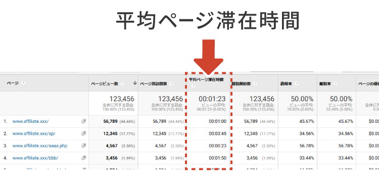 アフィリエイト記事では、単に文章を読まれているだけでなく、しっかりと内容が理解されることが成果につながります。そのために平均エンゲージメント時間を確認しましょう。