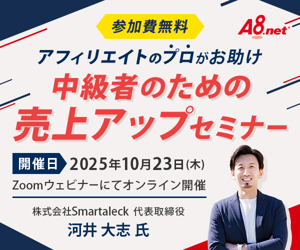 ※本セミナーはサイト審査制となります。審査基準は開示できかねますので、予めご了承ください。※審査結果は、A8.netに登録されているメールアドレス宛てにお送りさせていただきます。